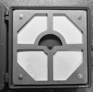 Garnitura de usa din fonta turnata cu trap de reglare tiraj. Finisaj negru-mat.
